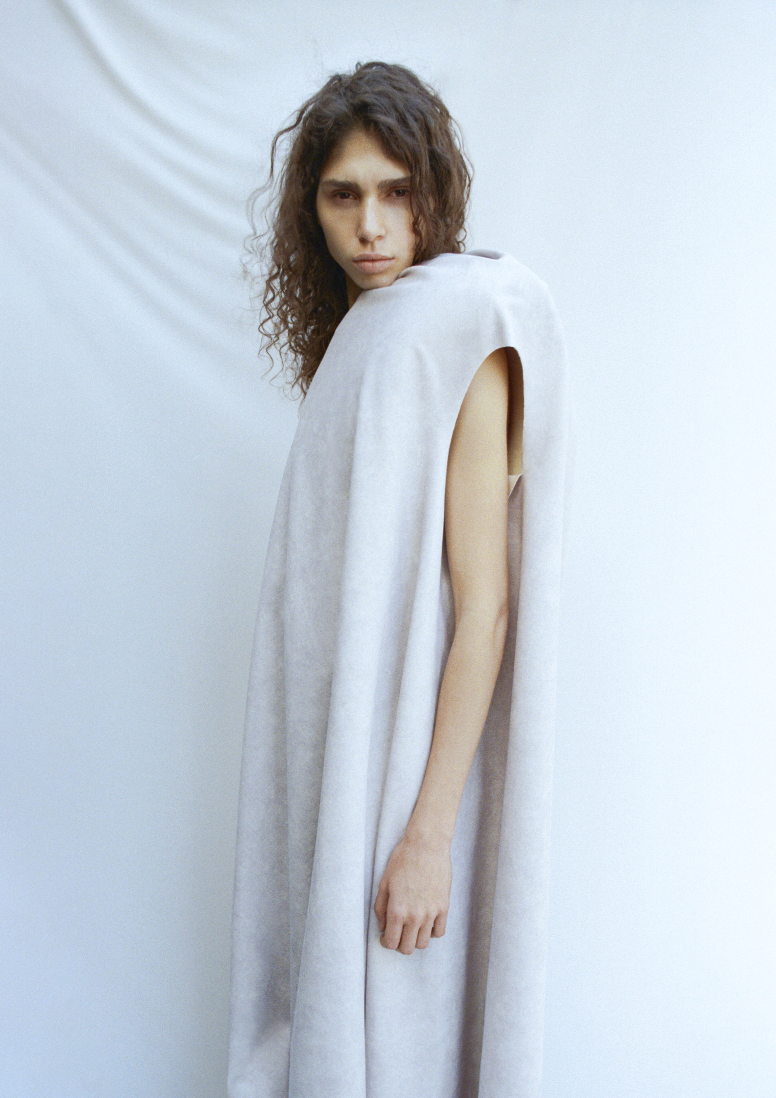 Garments do not simply cover the body; they record it. This project explores the interaction between body and material through a series of live fittings, where each look is constructed directly on the model. Using found and repurposed textiles, carpets, industrial offcuts, and fabric remnants, these pieces are assembled without sewing, allowing them to shift and respond to the body in real time. Movement, pressure and contact shape the garments as much as the materials shape the body. The result is a study in transformation and presence, where clothing becomes both a response to and a record of the body’s gestures.